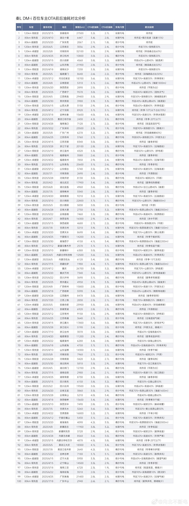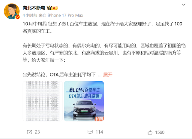 为验证OTA之后的真实油耗下降情况,博主“@ 向北不断电”征集了100位秦L的真实车主,汇集他们用车的真实油耗表现。