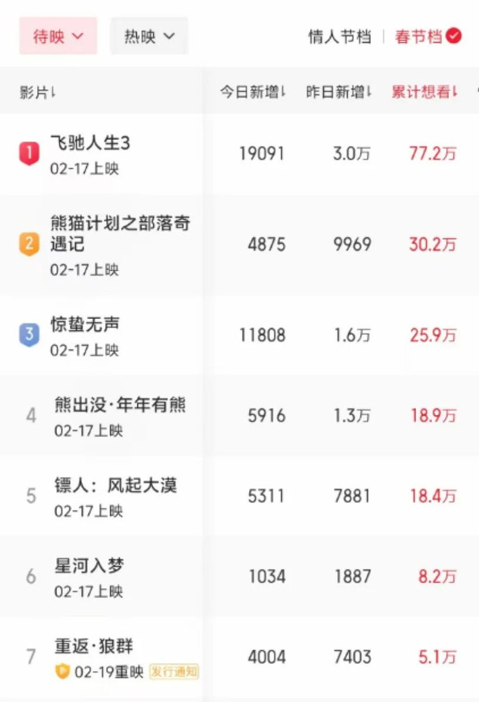 作为史上最长春节假期,今年春节档能否复刻过去繁荣的景象?截至2月6日收盘,《飞驰人生3》猫眼累计想看人数超过77万,《熊猫计划之部落奇遇记》猫眼累计想看超过30万,《惊蛰无声》猫眼累计想看接近26万。