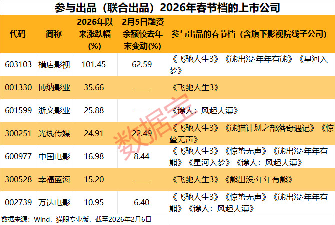 从年涨跌幅来看,截至2月6日,这7家公司2026年以来累计涨幅均值为33%,横店影视、博纳影业、浙文影业、光线传媒涨幅居前。其中,横店影视年内涨幅超过100%。