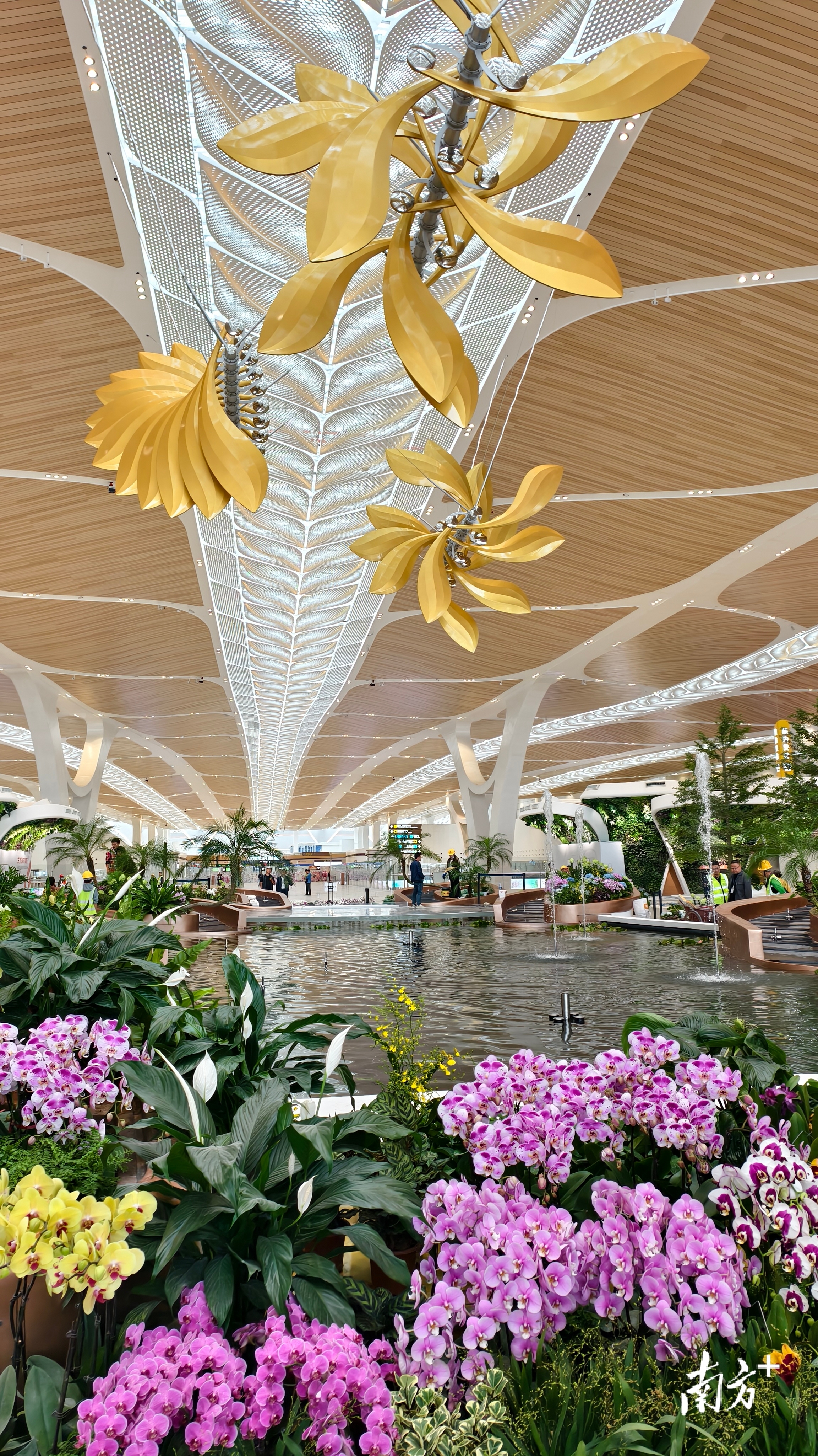 T3航站楼“稻穗”形天窗与鲜花相映成趣。 《南方》杂志记者左志红 拍摄
