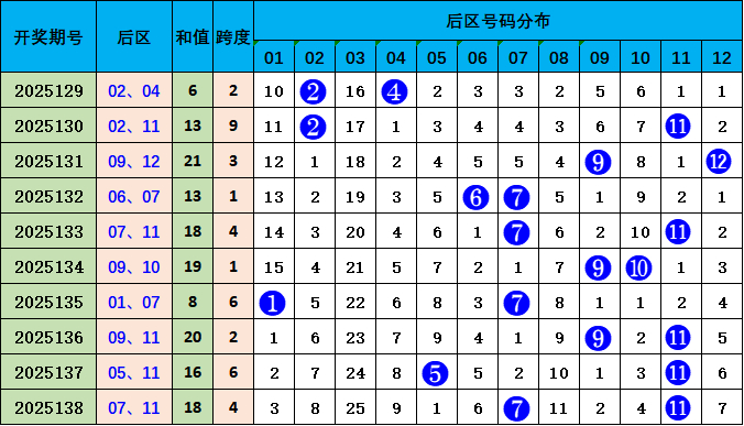 后区分析:上期后区开出07 11,跨度4,近十期跨度是:2、9、3、1、4、1、6、2、6、4,波动范围较大,跨度范围在1-9之间,本期预计跨度值上升,重点关注号码03 08,跨度5。