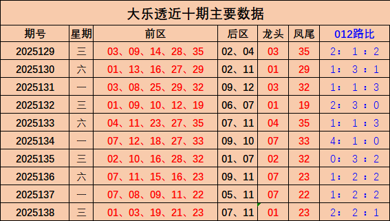 大乐透上期开奖号前区为:01 03 19 21 23,后区07 11;012路比2:2:1,龙头开出01,凤尾开出23