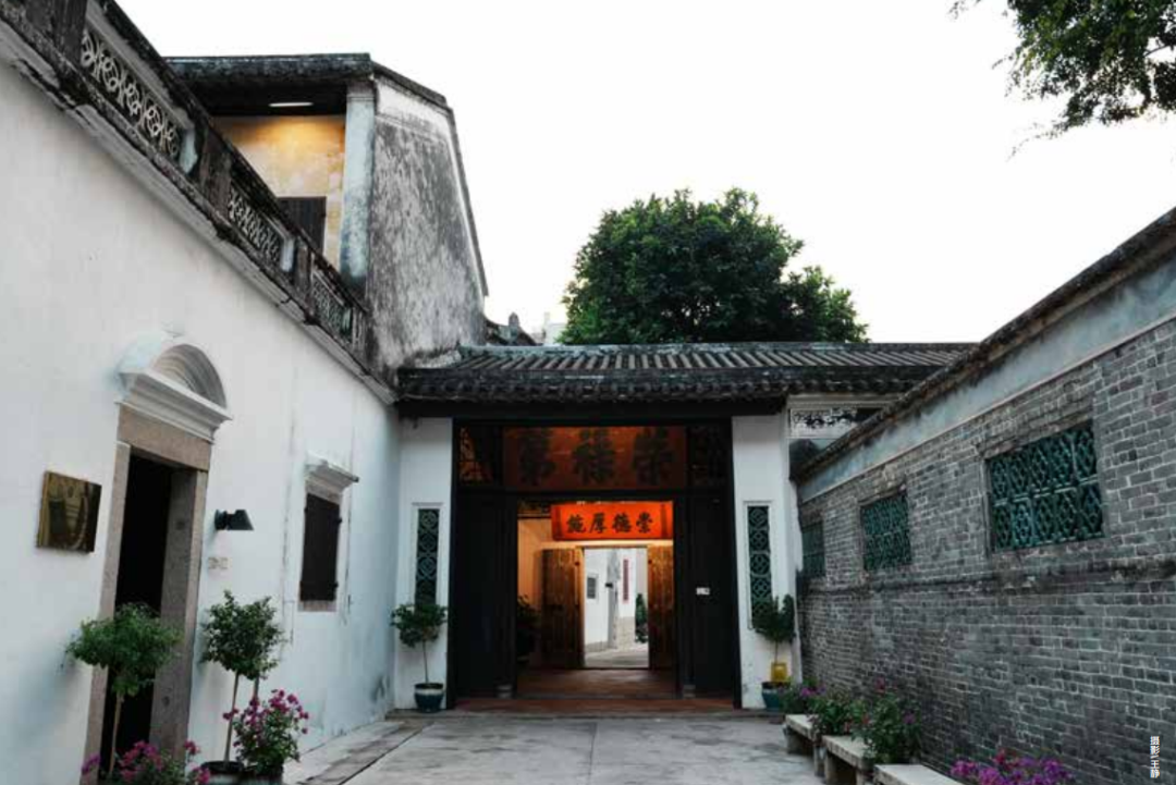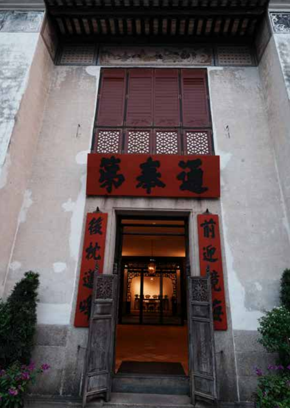 郑家大屋主建筑余庆堂入口,采用传统的广东式凹门斗做法。门口挂有“通奉第”牌匾,两侧对联分别是“前临镜海”和“后枕莲峰”,概括了大屋选址时背山面海的环境格局和景观意象