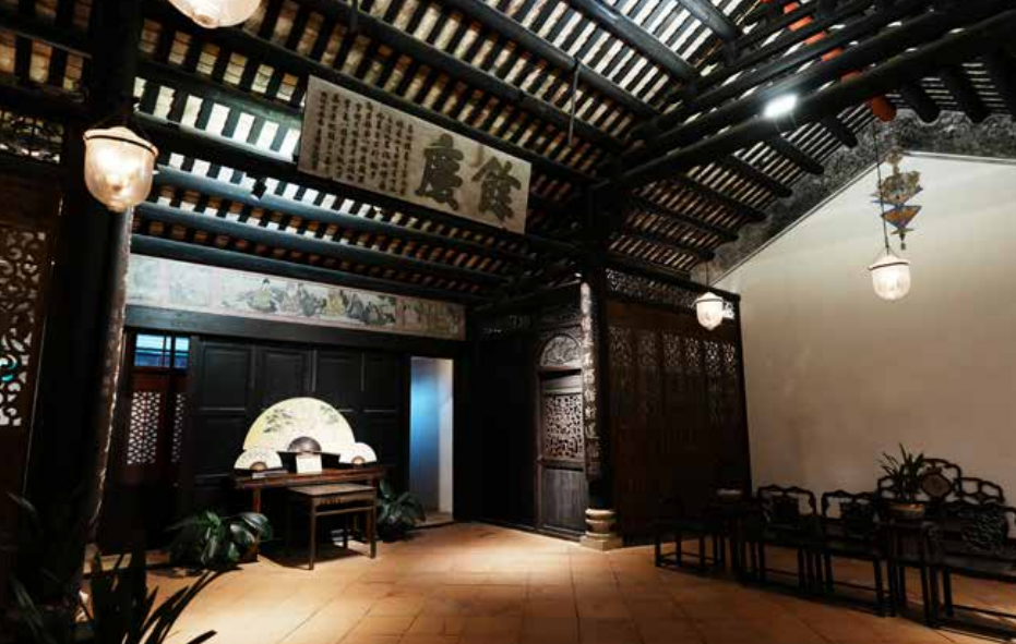 郑家大屋主屋余庆堂主厅。厅内四条木柱上挂有楹联,分别书写郑家的处世训言,横梁上则挂有“余庆”牌匾